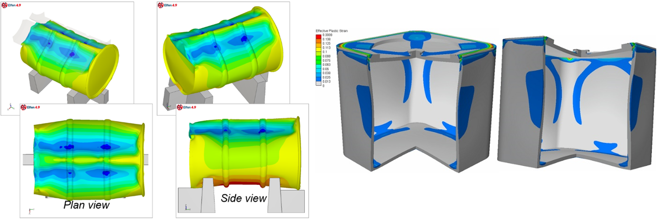 The nuclear waste is placed in canisters or boxes, depending on the type of radioactive waste, prior to placement within the repository. The canisters or boxes are essentially the last line of defence of the engineered barrier system of a waste repository. The steel boxes can be 5cm thick with both canisters and boxes having lids welded which must remain watertight to maintain integrity. The boxes and canisters are constrained from outward deformation within the RC pit due to surrounding containers. Consequently, the degradation and expansion which occurs due to corrosion of the steel results can sometimes result in an inward buckling. Rockfield have assessed the impact of the percentage fill, stacking arrangement of the containers and the corrosion degradation and expansion upon the containers ability to remain watertight over the lifespan of the facility.